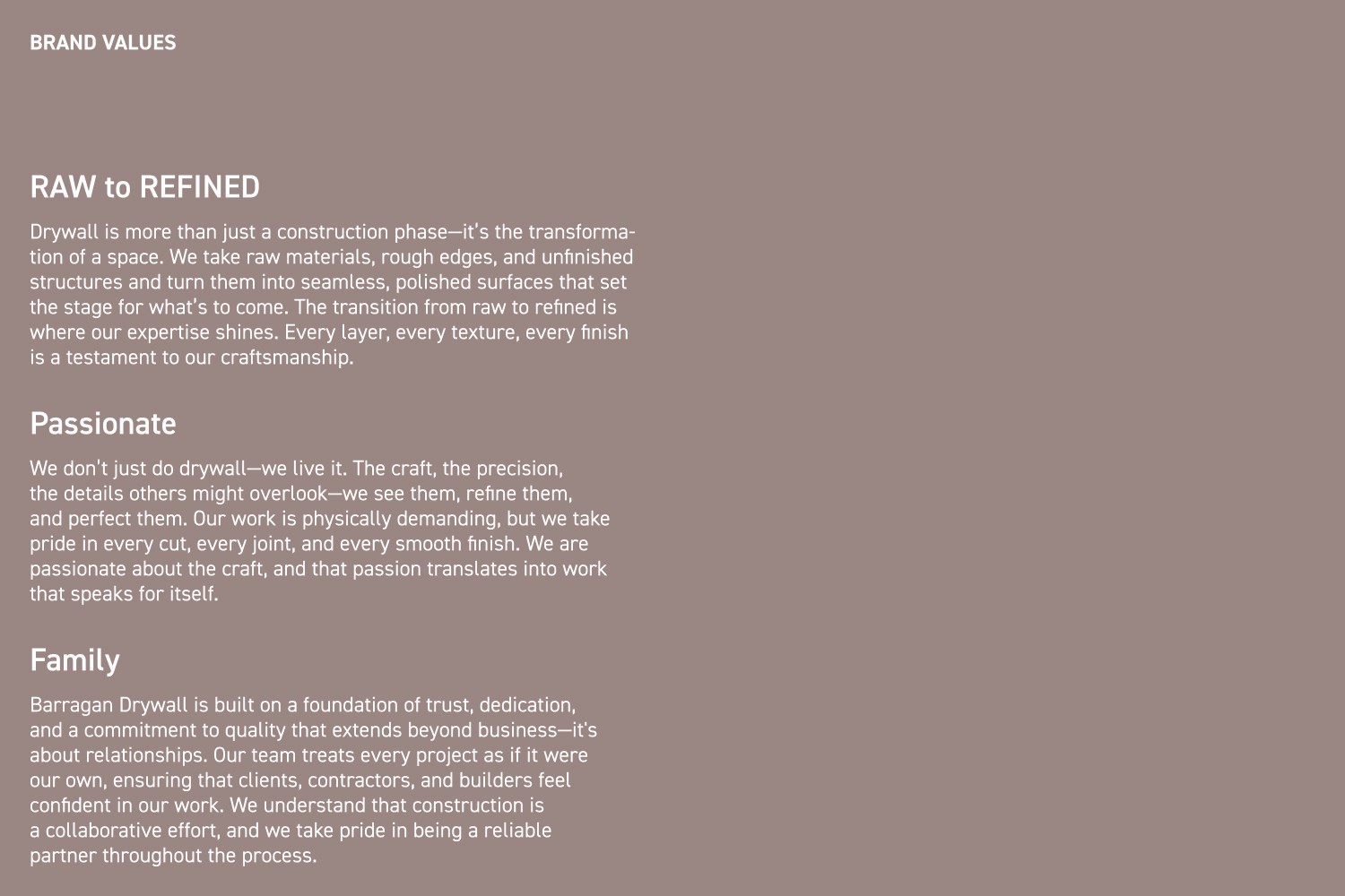 Barragan Drywall is a family-run drywall company based in the San Francisco Bay Area, known for craftsmanship and precision. In collaboration with FZK, Newtide led a rebrand—updating the company’s legacy logo, brand positioning, and visual identity to reflect its core philosophy of raw to refined and the high quality of its work.